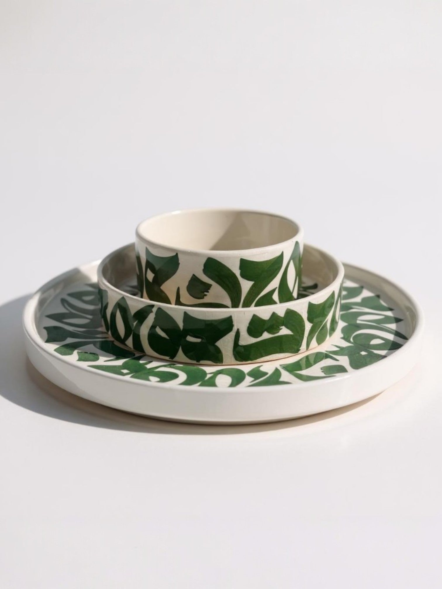 All pieces are handmade ceramic, inspired by Arabic calligraphy, making this set ideal for family Iftars and hosting guests during Ramadan.